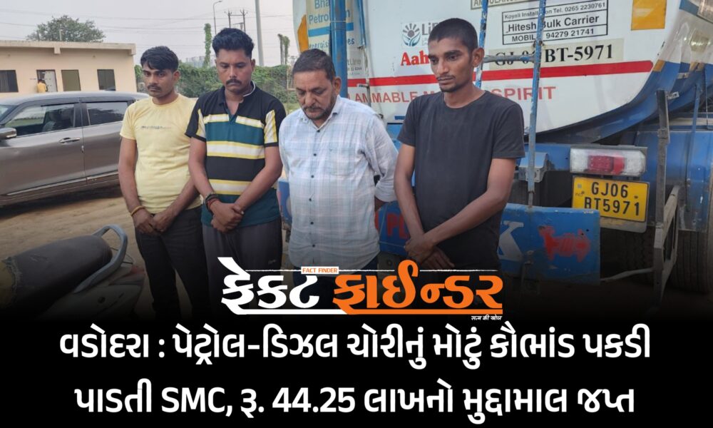 શહેરમાં દરોડામાં રૂ. 18.48 લાખની કિંમતનું પેટ્રોલ-ડિઝલ, રોકડ, મોબાઇલ, વાહન અને ટેન્કર મળીને કુલ રૂ. 44.25 લાખનો મુદ્દામાલ જપ્ત કરાયો વડોદરા શહેર પોલીસમાં આવતા જવાબર નગર...