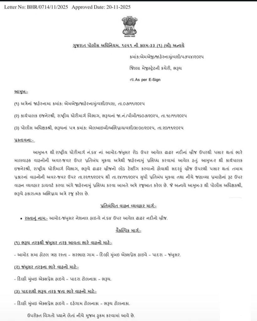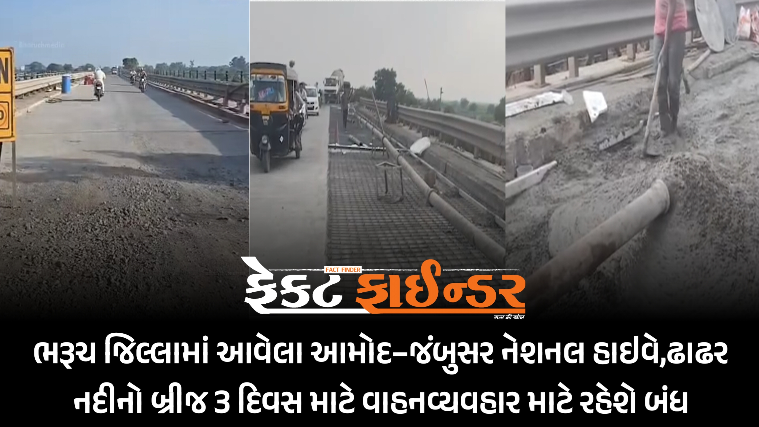 ભરૂચ જિલ્લામાં આવેલા આમોદ–જંબુસર નેશનલ હાઇવે,ઢાઢર નદીનો બ્રીજ 3 દિવસ માટે વાહનવ્યવહાર માટે રહેશે બંધ