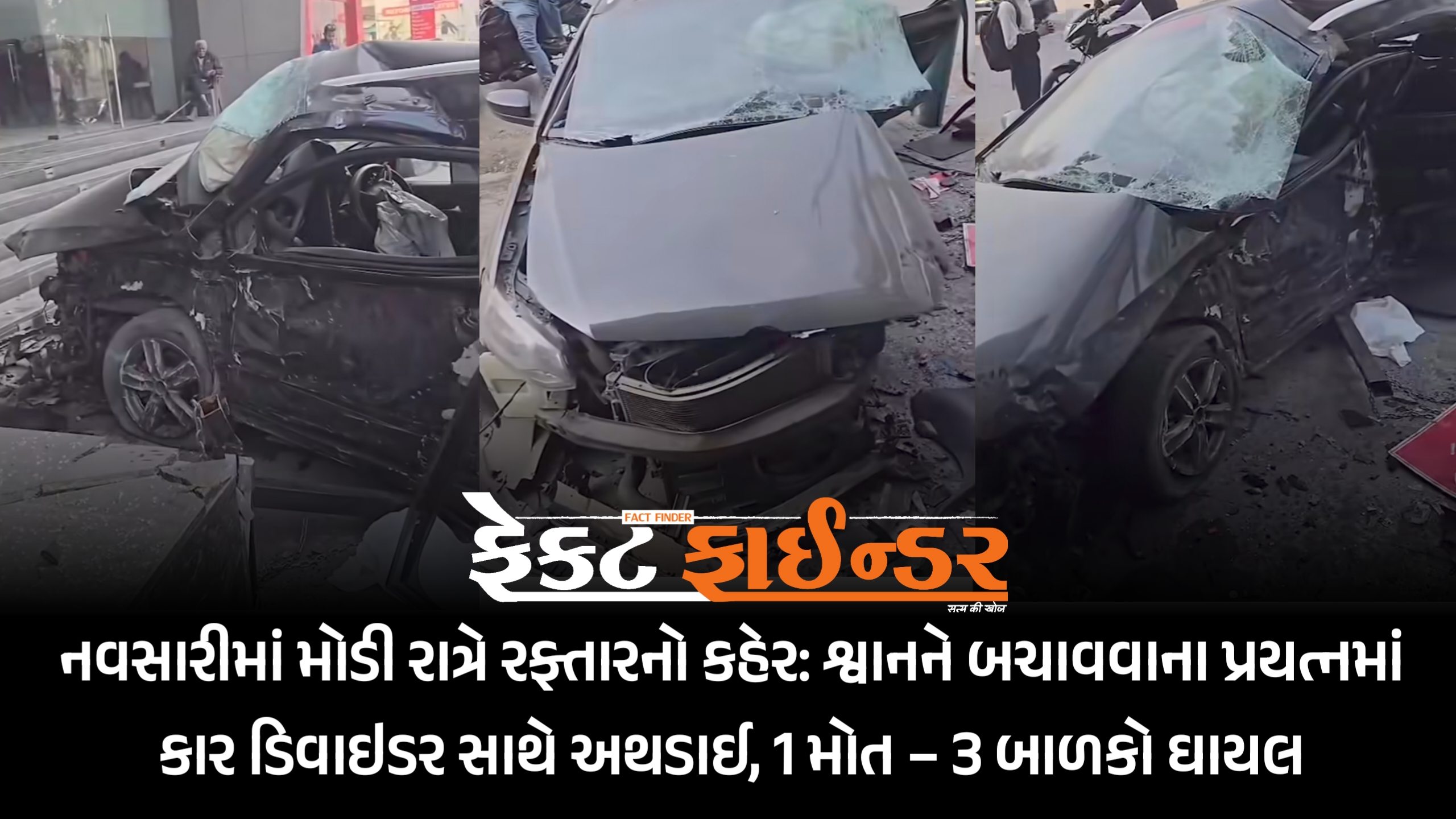 નવસારીમાં મોડી રાત્રે રફ્તારનો કહેર: શ્વાનને બચાવવાના પ્રયત્નમાં કાર ડિવાઇડર સાથે અથડાઈ, 1 મોત – 3 બાળકો ઘાયલ