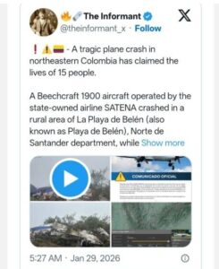 કોલંબિયામાં ભયાનક વિમાન દુર્ઘટના: સાંસદ સહિત તમામ 15 મુસાફરોના કરુણ મોત