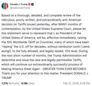 અમેરિકાના રાષ્ટ્ર પ્રમુખ ડોનાલ્ડ ટ્રમ્પે ગ્લોબલ ટ્રેડને લઈને એક મોટો ધડાકો કર્યો છે. સુપ્રીમ કોર્ટના આદેશ બાદ રોષે ભરાયેલા ટ્રમ્પે માત્ર 24 કલાકમાં જ પોતાનો નિર્ણય બદલીને વિશ્વના તમામ દેશો પરનો ટેરિફ 10% થી વધારીને 15% કરી દીધો છે. આ નિર્ણયને પગલે સમગ્ર વિશ્વના બજારોમાં ખળભળાટ મચી ગયો છે. ટ્રમ્પના આ ‘તઘલખી’ ગણાતા નિર્ણય પાછળ સુપ્રીમ કોર્ટ સાથેનો તેમનો ટકરાવ મુખ્ય કારણ માનવામાં આવી રહ્યો છે.