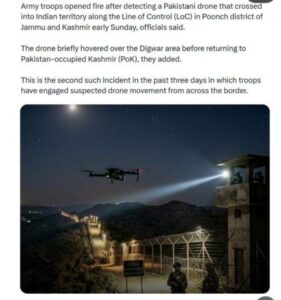 • વહેલી સવારની હિલચાલ: રવિવારે મળસ્કે જ્યારે પૂંછ જિલ્લામાં નિયંત્રણ રેખા પર ધુમ્મસભર્યું વાતાવરણ હતું, ત્યારે પાકિસ્તાન તરફથી એક શંકાસ્પદ ડ્રોન ભારતીય હવાઈ ક્ષેત્રમાં પ્રવેશ્યું હતું.