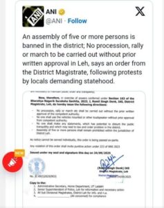 લદ્દાખના લેહના જિલ્લા મેજિસ્ટ્રેટ રોમિલ સિંહ ડોંકે તાત્કાલીક અસરથી વિરોધ પ્રદર્શનો, રેલીઓ અને પાંચ કે તેથી વધુ વ્યક્તિઓના એકઠા થવા પર પ્રતિબંધ મૂકતો આદેશ જારી કર્યો છે. ભારતીય નાગરિક સુરક્ષા સલેહના જિલ્લા મેજિસ્ટ્રેટ રોમિલ સિંહ ડોંકે તાત્કાલીક અસરથી વિરોધ પ્રદર્શનો, રેલીઓ અને પાંચ કે તેથી ંહિતા-2023ની કલમ 163 હેઠળ જારી કરાયેલા આ આદેશનું ઉલ્લંઘન કરનારાઓ સામે કડક કાર્યવાહી કરાશે. આ ઉપરાંત જાહેર શાંતિનો ભંગ કરવા જેવા અથવા કાયદો-વ્યવસ્થા માટે ખતરો ઊભો થઈ શકે તેવા વાંધાજનક નિવેદન આપવા પર પણ પ્રતિબંધ ફરમાવાયો છે, જો તેનું ઉલ્લંઘન થશે તો ભારતીય ન્યાય સંહિતા-2023ની કલમ 223 હેઠળ કાર્યવાહી કરવામાં આવશે.