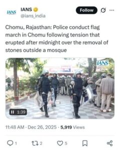 જયપુરના ચોમૂમાં મોડી રાત્રે ભારે હંગામો,સુરક્ષાના ભાગરૂપે ચોમૂમાં 24 કલાક માટે ઇન્ટરનેટ સેવાઓ ઠપ્પ.