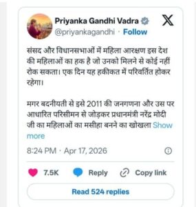 મહિલા અનામતનું ‘મહાઘમાસાણ’: પ્રિયંકા ગાંધીનો મોદી સરકારને પડકાર – “હિંમત હોય તો સોમવારે જૂનું બિલ રજૂ કરો.”