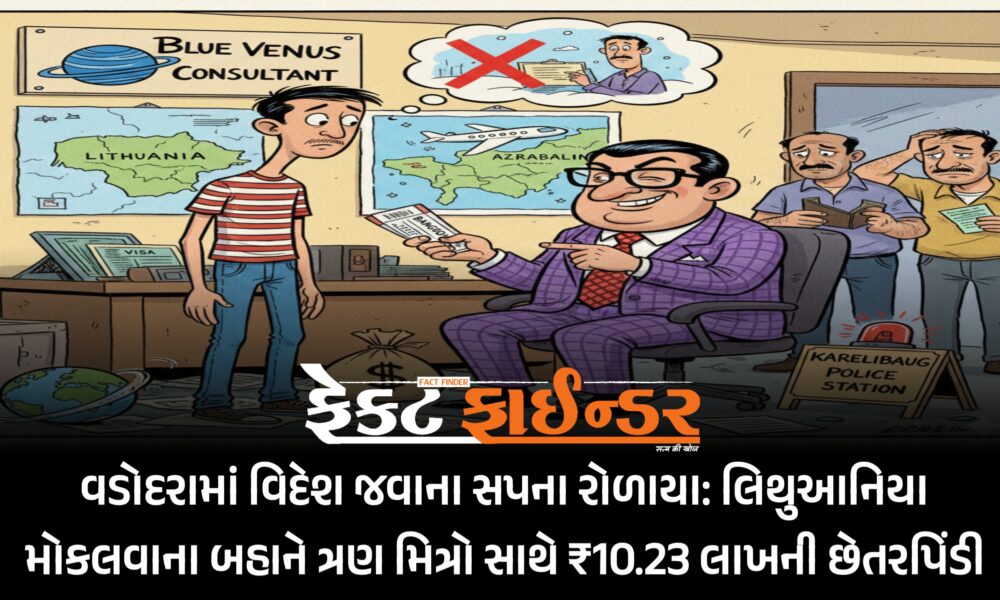 વડોદરા: માંડવી વિસ્તારમાં રહેતા એક યુવક સહિત ત્રણ મિત્રોને લિથુઆનિયા મોકલવાની લાલચ આપી કુલ ₹10.23 લાખ પડાવી લેનાર કન્સલ્ટન્ટ વિરુદ્ધ કારેલીબાગ પોલીસ સ્ટેશનમાં ફરિયાદ નોંધાઈ છે....
