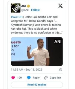 રાહુલ ગાંધીએ ચીફ ઈલેક્શન કમિશનર જ્ઞાનેશ કુમાર પર આરોપ મૂકતાં કહ્યું કે, હું તમામ સચોટ પુરાવા સાથે કહુ છું કે, જ્ઞાનેશ કુમાર દેશના વોટ ચોરોનું રક્ષણ કરી રહ્યા છે. લઘુમતી, દલિત, ઓબીસી કેટેગરીના વોટ ચોરી થઈ રહ્યા છે.