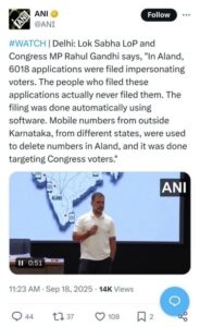 • પોતાની ‘વોટર અધિકાર યાત્રા’ પૂર્ણ થયા બાદ રાહુલે દાવો કર્યો હતોકે,  તેમનો પક્ષ ‘વોટ ચોરી’ મુદ્દે ટૂંક સમયમાં જ ‘હાઈડ્રોજન બોમ્બ’નો ખુલાસો કરશે