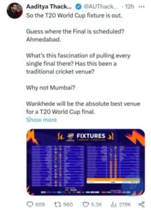 T20 વર્લ્ડ કપ શેડ્યૂલ જાહેર થતા જ આદિત્ય ઠાકરાનું અમદાવાદ પર મોટું નિવેદન!