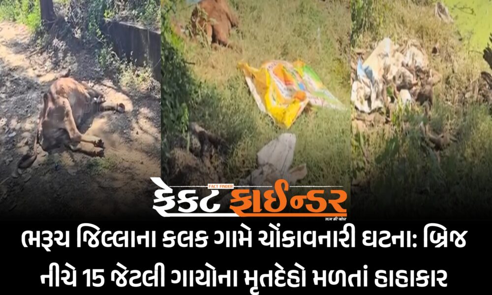 ભરૂચ જિલ્લાના જંબુસર તાલુકાના કલક ગામ નજીક બ્રિજ નીચે 12થી 15 જેટલી ગાયોના મૃતદેહો મળ્યા.ઘટના સામે આવતા ગામમાં હડકંપ મચી ગયો. ભરૂચ જિલ્લાના જંબુસર તાલુકાના કલક...