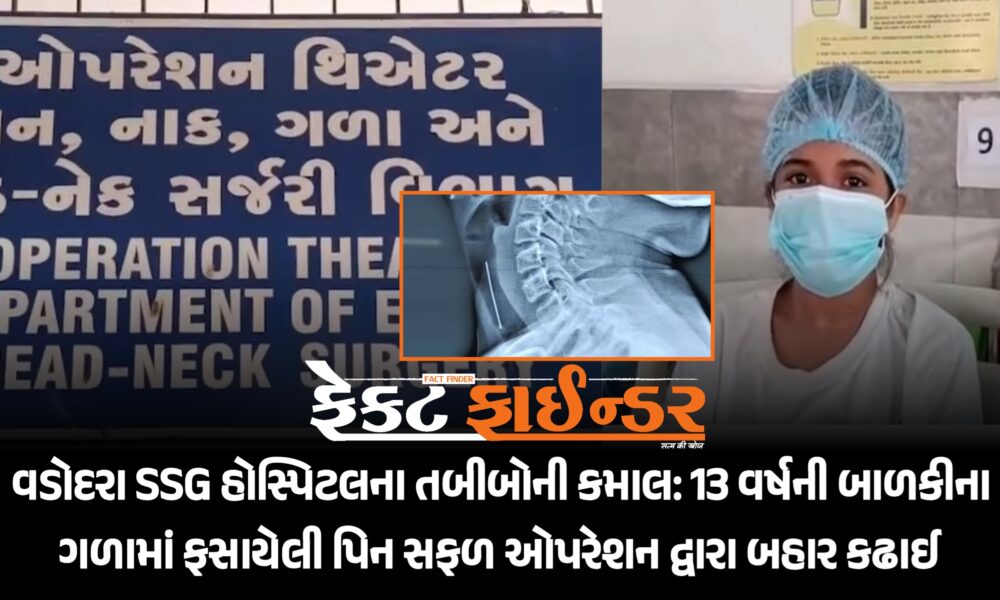 વડોદરા SSG હોસ્પિટલના તબીબોની કમાલ: 13 વર્ષની બાળકીના ગળામાં ફસાયેલી પિન સફળ ઓપરેશન દ્વારા બહાર કઢાઈ
