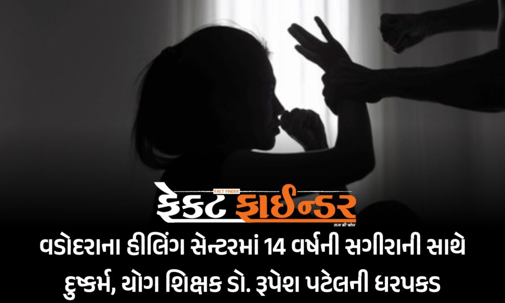 છાણી વિસ્તારમાં આવેલા ‘આલ્ફા હીલિંગ સેન્ટર’માં 14 વર્ષીય સગીરાની સાથે દુષ્કર્મની ઘટના બની.આરોપી: યોગ અને મેડિટેશન શિક્ષક ડો. રૂપેશ પટેલ. સંસ્કારી નગરી વડોદરામાંથી એક શરમજનક ઘટના...