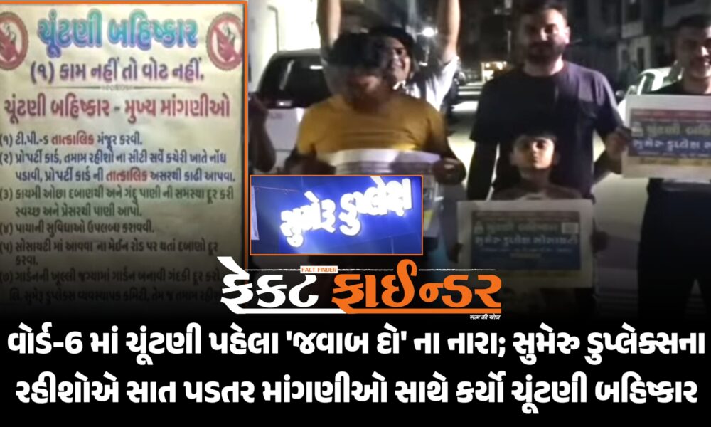વડોદરા: સ્માર્ટ સિટી વડોદરાના વોર્ડ નંબર 6 માં સ્થાનિક સ્વરાજની ચૂંટણી પહેલા જ જનતાએ સત્તાધીશો સામે મોરચો માંડ્યો છે. ખોડિયાર નગર પાસે આવેલી સુમેરુ ડુપ્લેક્સ સોસાયટીના...