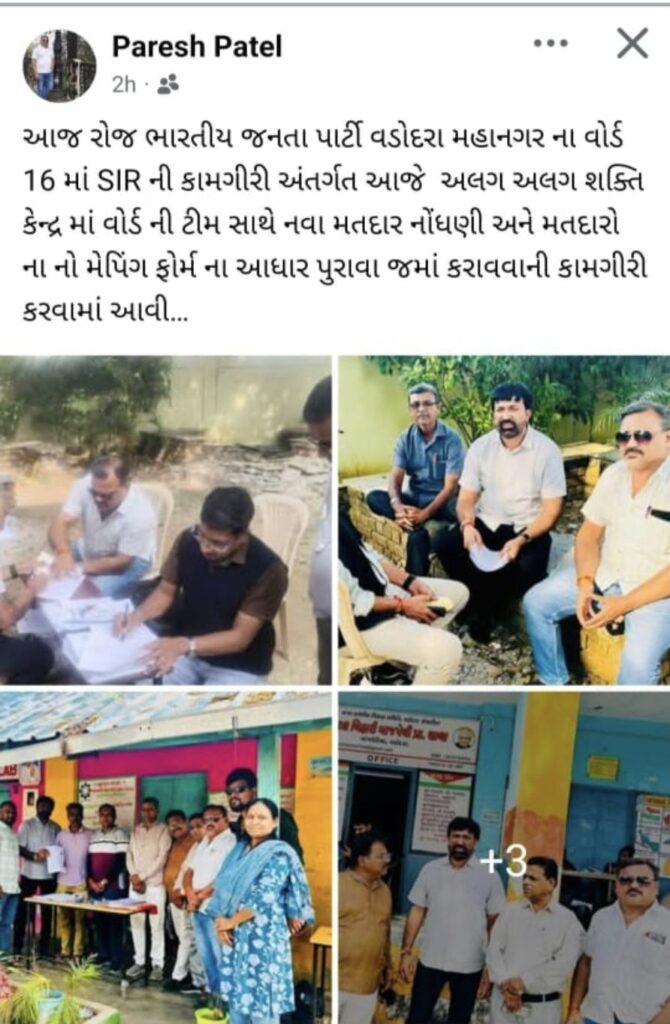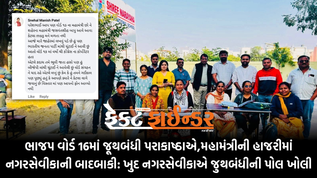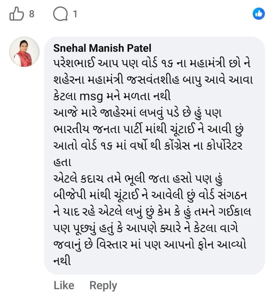 વોર્ડ 16માં ભાજપના સંગઠન દ્વારા SIRની કામગીરી માટે શક્તિકેન્દ્ર અને બુથ કક્ષાએ મતદારોના નો મેપિંગ ફોર્મ જમા લેવાની કામગીરી હાથ ધરવામાં આવી હતી, આ કામગીરીમાં શહેર ભાજપ મહામંત્રી પણ ખાસ હાજર રહ્યા હતા. આટલા મહત્વના કાર્યક્રમમાં મહિલા નગરસેવક સ્નેહલબેન પટેલને બોર્ડના હોદ્દેદારો દ્વારા આમંત્રણ સુધ્ધા પાઠવવામાં આવ્યું ન હોવાનો ખુલાસો ખુદ સ્નેહલબેન પટેલે સોશ્યલ મીડિયા કોમેન્ટમાં કર્યો હતો. જ્યાં તેઓએ લખવું પડ્યું હતું કે તેઓ પણ ભાજપ માંથી ચૂંટાઈને આવેલા છે.વોર્ડ મહામંત્રી પરેશ પટેલે મુકેલી કાર્યક્રમની પોસ્ટમાં મહિલા નગરસેવકની કોમેન્ટ આંખે ઉડીને વળગી હતી. જ્યાં તેઓએ પોતાની નારાજગી વ્યક્ત કરતા વોર્ડ સંગઠનને ટોણો પણ માર્યો હતો. વોર્ડ મહામંત્રીને પૂછવા છતાંય તેઓએ મેસેજ આપ્યો ન હોવાની વાત પણ કોમેન્ટમાં લખવામાં આવી હતી.