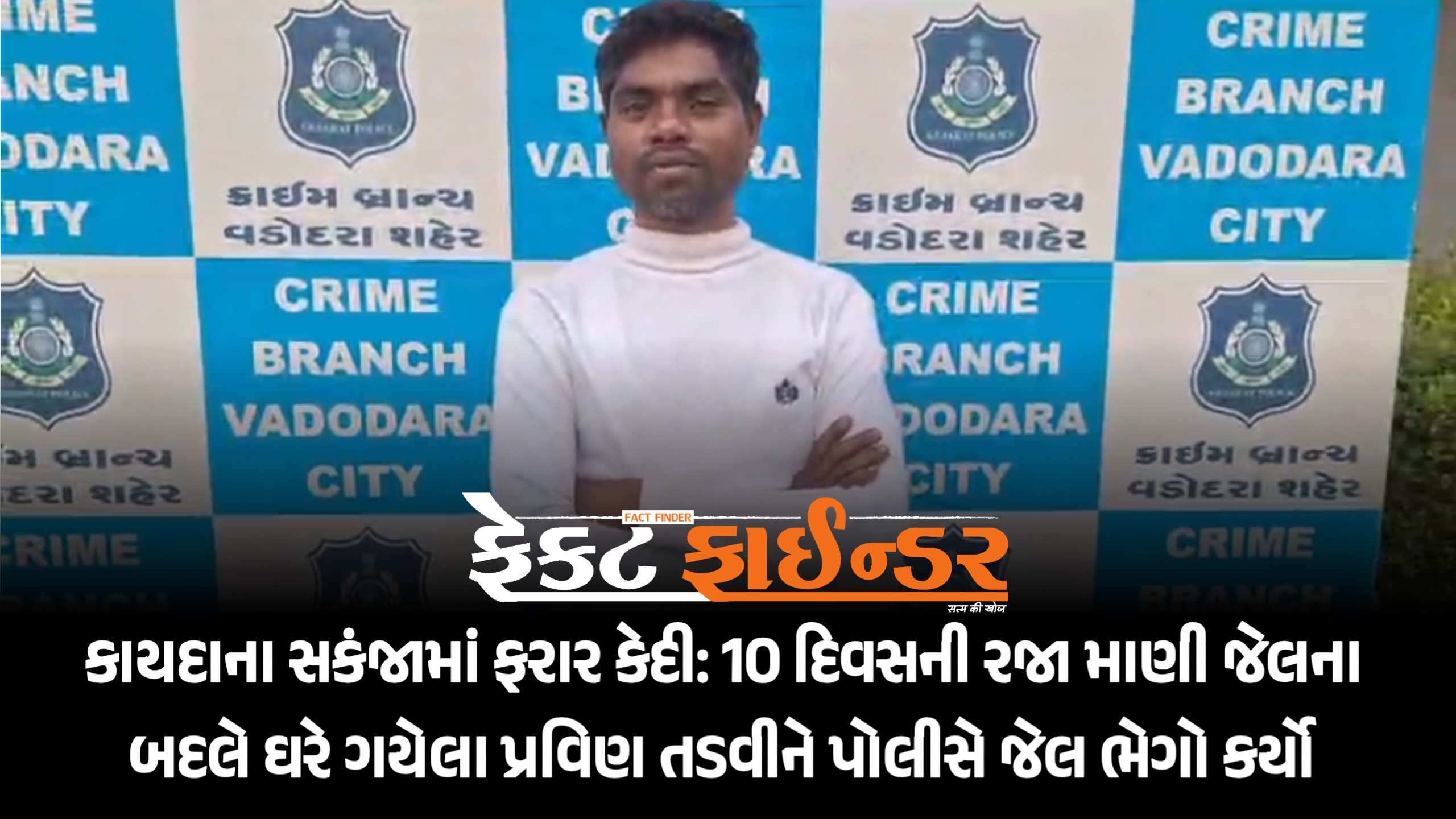 મૂળ છોટાઉદેપુરના બોડેલી તાલુકાના ખોડીયા ગામનો રહેવાસી પ્રવિણ તડવી વર્ષ 2013માં નોંધાયેલા હત્યાના ગુનામાં વડોદરા જેલમાં પાકા કામના કેદી તરીકે સજા કાપી રહ્યો હતો. ગત 12 માર્ચ 2026ના રોજ તે જેલમાંથી 10 દિવસની વચગાળાની રજા પર મુક્ત થયો હતો. નિયમ મુજબ તેને 23 માર્ચ 2026ના રોજ જેલમાં પરત હાજર થવાનું હતું, પરંતુ તે સમયસર હાજર ન થઈ બારોબાર ફરાર થઈ ગયો હતો.