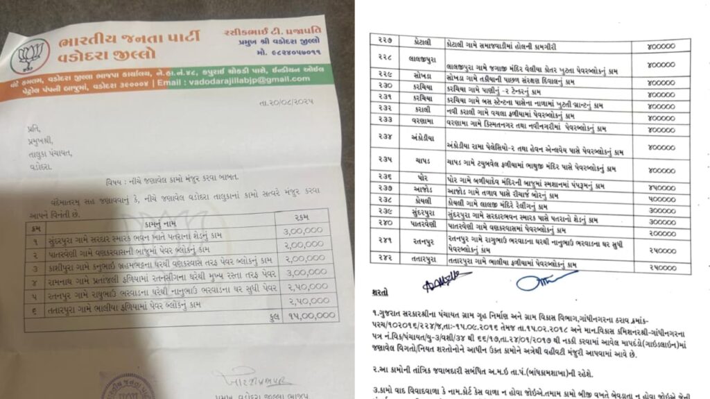 ગત 20 ઓગસ્ટે રસિકભાઈ પ્રજાપતિએ વડોદરા તાલુકા પંચાયત પ્રમુખને એક પત્ર લખ્યો, જે પત્રમાં તેઓએ 15 લાખના કામોનું આયોજન લખીને તે કામોને મંજુર કરવા માટે વિનંતી કરી, જીલ્લા ભાજપ અધ્યક્ષ હોવાને કારણે તેઓ ચુંટાયેલા પ્રતિનિધિઓને વિકાસના કામોની વિનંતી કરી શકે. જેમાં કામોના અંદાજીત ખર્ચ માટે દરખાસ્ત આવ્યા બાદ એસ્ટીમેટ નીકળતું હોય છે. અહિયાં તો રસિકભાઈએ વિકાસના કામોમાં તેની સામે રકમ પણ લખી દીધી છે..આ લેટરમાં રસિકભાઈએ સુચવેલા 6 કામો માંથી 4 કામોને  તાલુકા પંચાયતની વર્ષ 2025-26ની સ્ટેમ્પ ડ્યુટીની ગ્રાન્ટ માંથી મંજુરી મળી ગઈ,.. રસિકભાઈએ ચુંટણી લડ્યા કે જીત્યા વિના 15 લાખના આયોજન માંથી 10 લાખના આયોજનની મંજુરી મેળવી  લીધી.