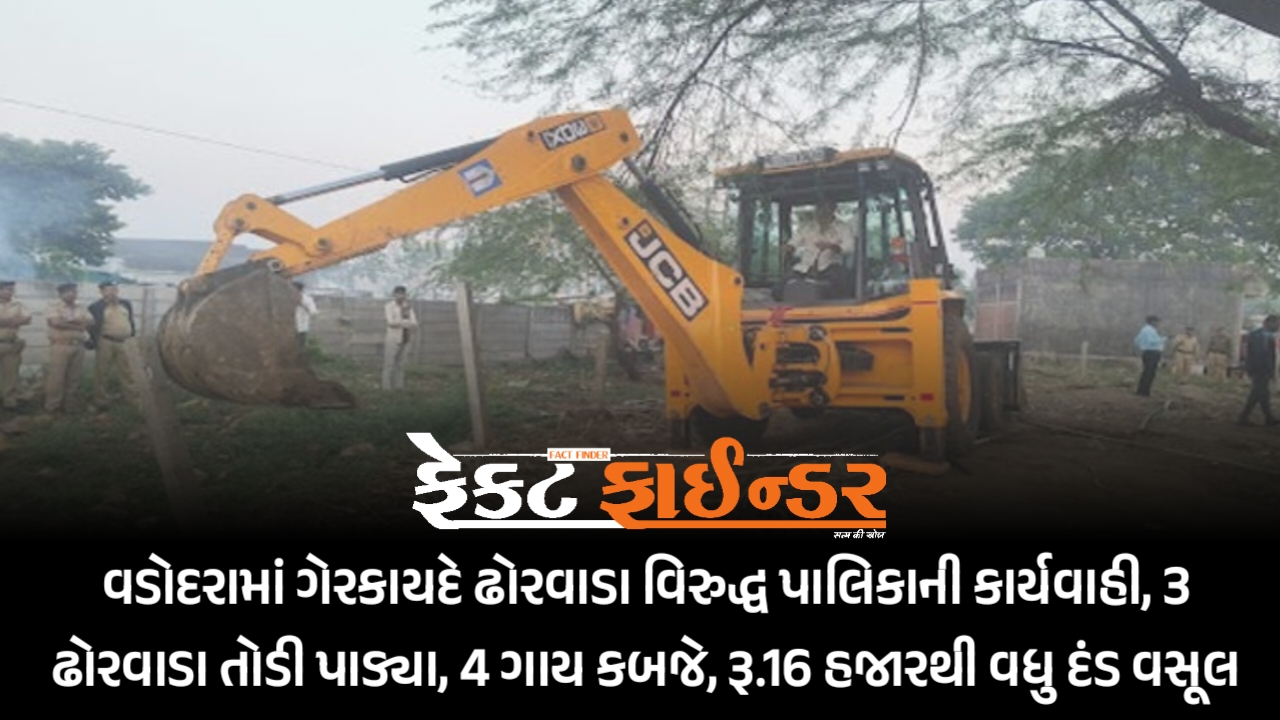 વડોદરામાં ગેરકાયદે ઢોરવાડા વિરુદ્ધ પાલિકાની કાર્યવાહી, 3 ઢોરવાડા તોડી પાડ્યા – 4 ગાય કબજે, રૂ.16 હજારથી વધુ દંડ વસૂલ