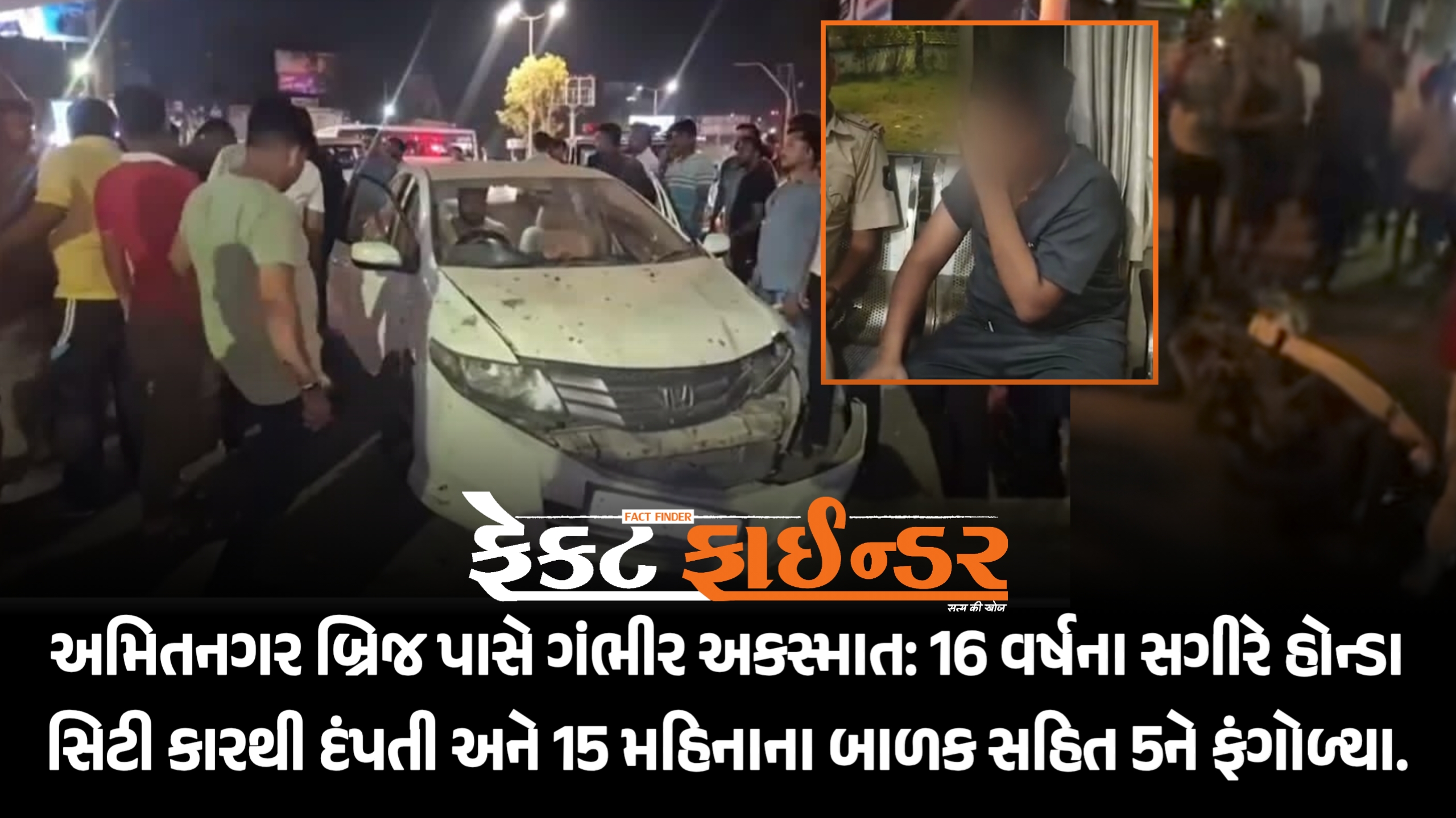 અમિતનગર બ્રિજ પાસે ગંભીર અકસ્માત: 16 વર્ષના સગીરે હોન્ડા સિટી કારથી દંપતી અને 15 મહિનાના બાળક સહિત 5ને ફંગોળ્યા.
