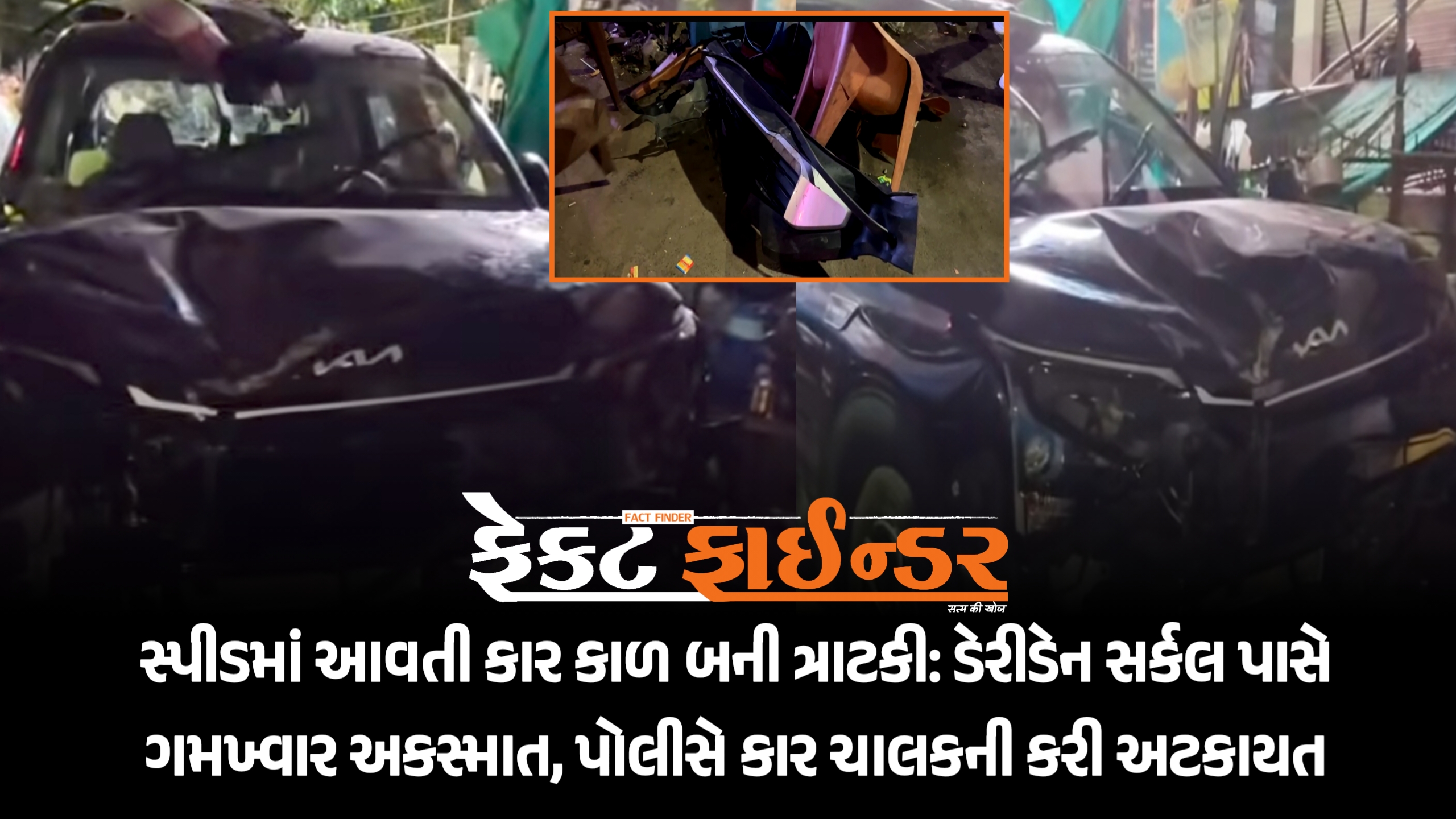 • બેફામ સ્પીડ: ડેરીડેન પાસે નવી નક્કોર ‘કિયા’ કારના ચાલકે સ્ટેયરિંગ પરથી કાબૂ ગુમાવ્યો; સીધી ચાની લારીમાં ઘૂસી ગઈ.