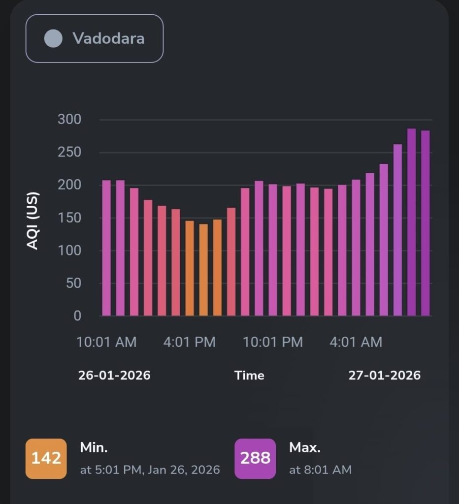 આંકડાની વાત કરીએ તો, આજે સવારે 7 થી 8 વાગ્યાની વચ્ચે વડોદરાનો AQI (Air Quality Index) 288 સુધી પહોંચી ગયો હતો. જો આ આંકડો 300 ને સ્પર્શે તો તેને ‘હેઝાર્ડસ’ એટલે કે અત્યંત જોખમી માનવામાં આવે છે. વડોદરા અત્યારે આ જોખમી સ્તરથી માત્ર 12 પોઈન્ટ દૂર છે.