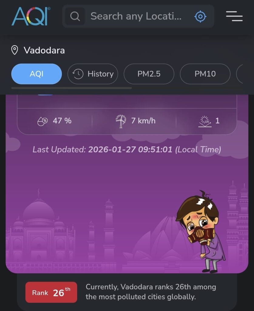 • વૈશ્વિક ક્રમાંક: પ્રદૂષણની ગંભીરતા એટલી છે કે વિશ્વના સૌથી પ્રદૂષિત શહેરોમાં વડોદરા હવે 26માં ક્રમે આવી ગયું છે.