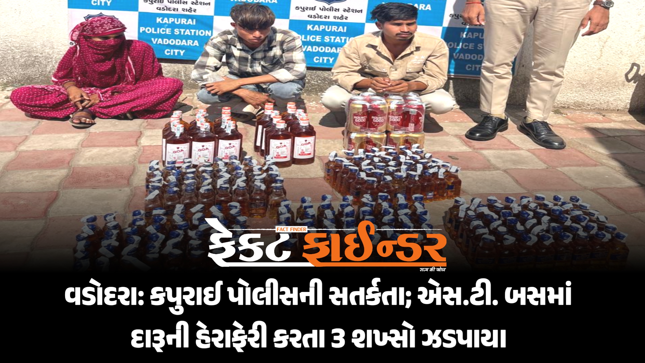 વડોદરા: કપુરાઈ પોલીસની સતર્કતા; એસ.ટી. બસમાં દારૂની હેરાફેરી કરતા 3 શખ્સો ઝડપાયા