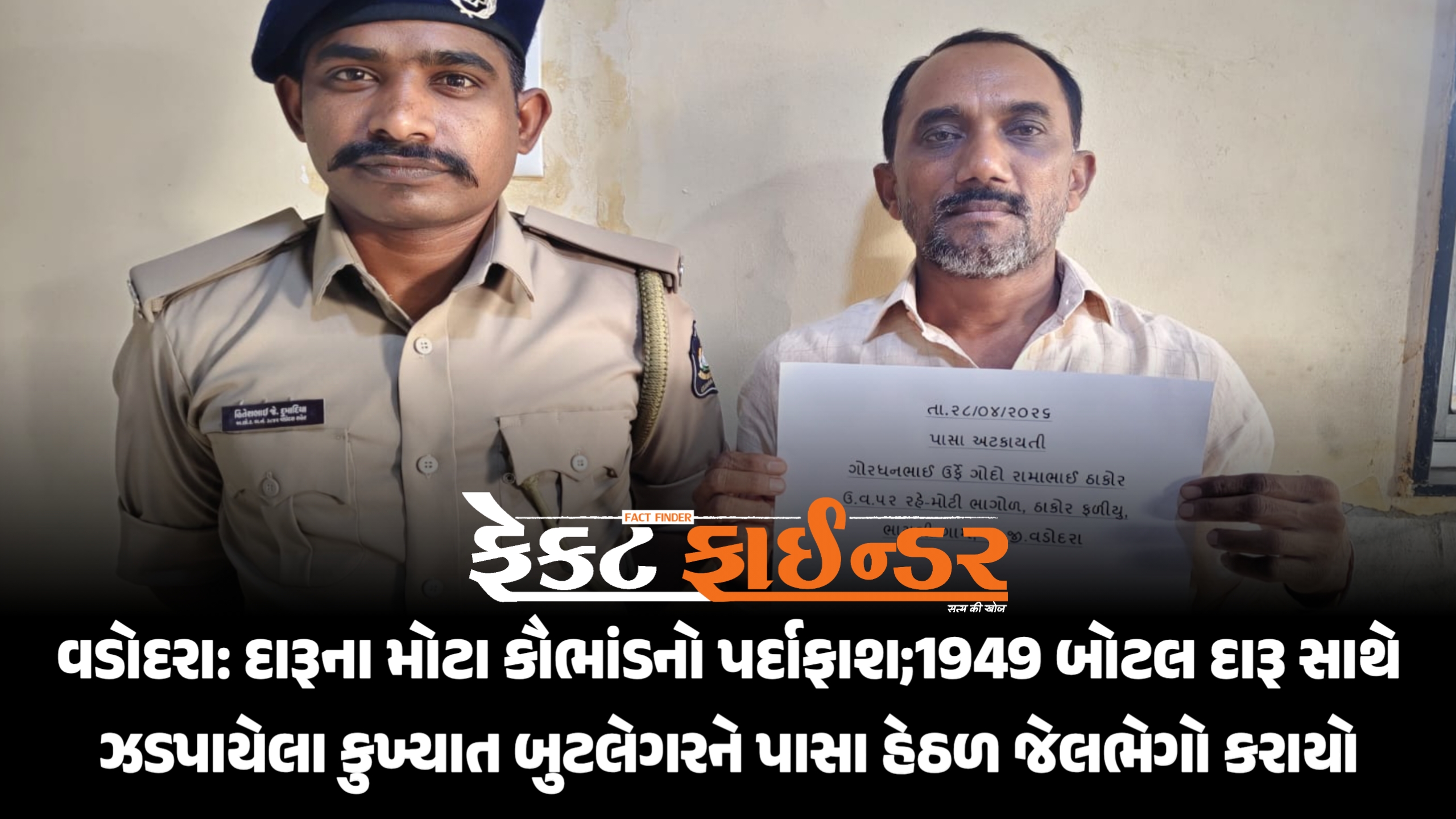 વડોદરા: દારૂના મોટા કૌભાંડનો પર્દાફાશ;1949 બોટલ દારૂ સાથે ઝડપાયેલા કુખ્યાત બુટલેગરને પાસા હેઠળ જેલભેગો કરાયો
