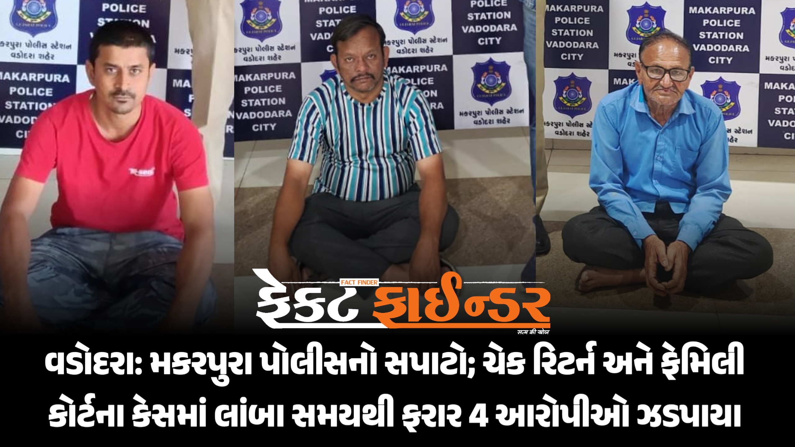 વડોદરા: મકરપુરા પોલીસનો સપાટો; ચેક રિટર્ન અને ફેમિલી કોર્ટના કેસમાં લાંબા સમયથી ફરાર 4 આરોપીઓ ઝડપાયા